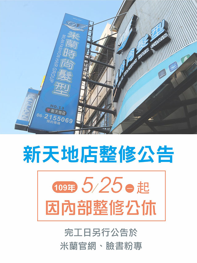 【米蘭-新天地店整修公告】為給您更舒適的環境與服務5/25(一)開始進行內部整修,暫停營業(開始營運時間另行公告)