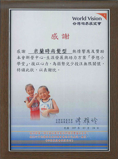 感謝狀 台灣世界展望會-夢想小學堂